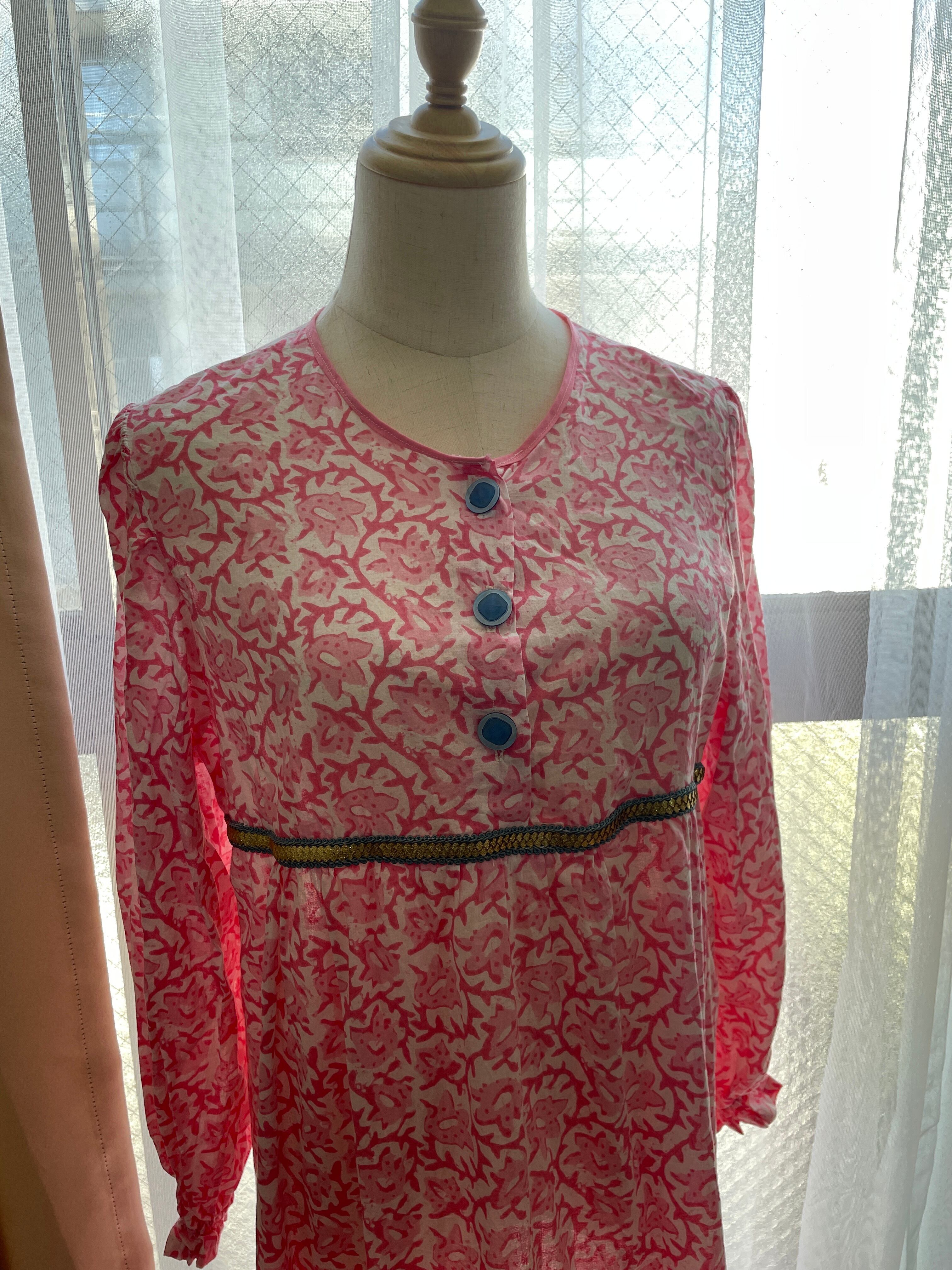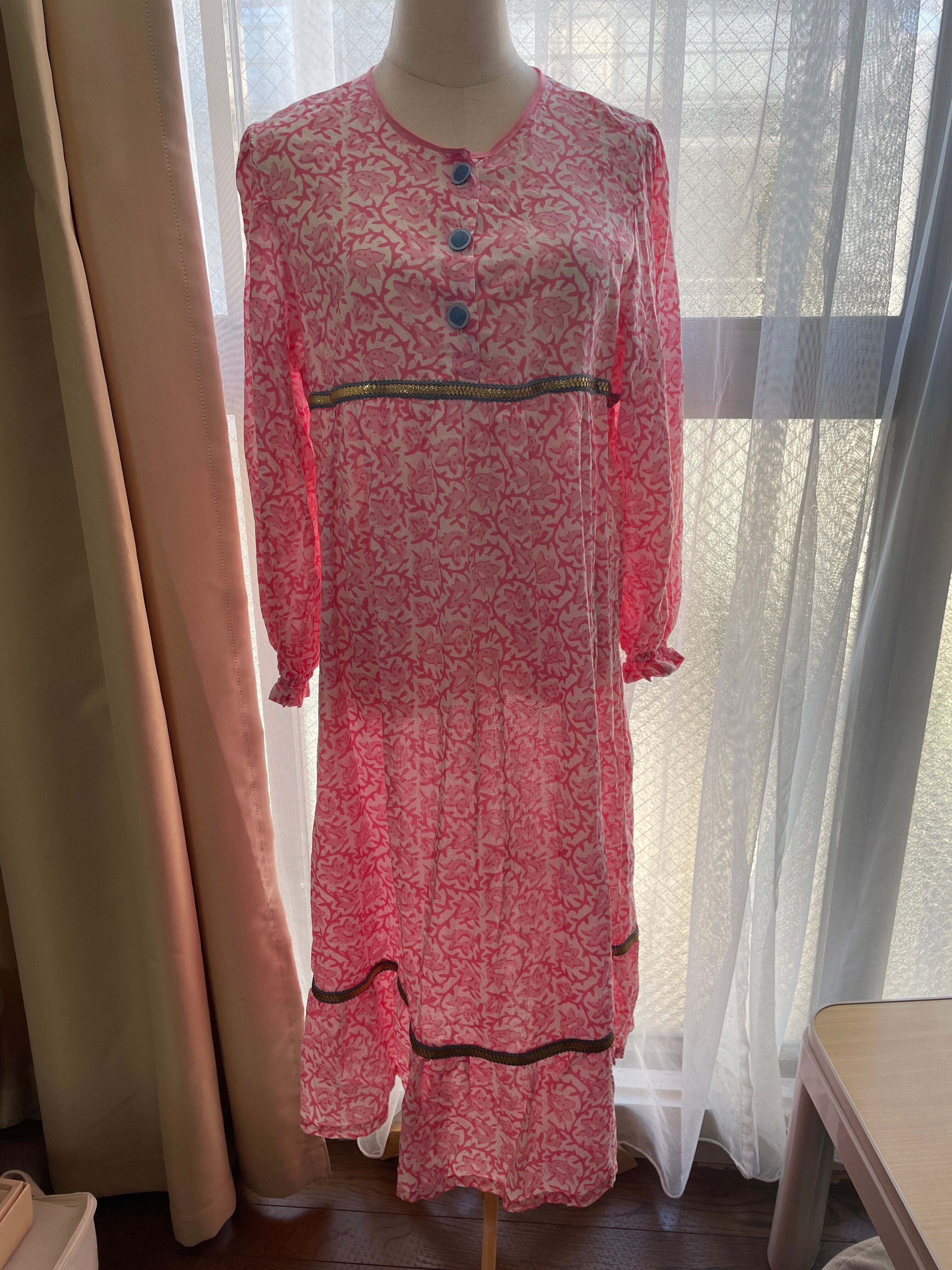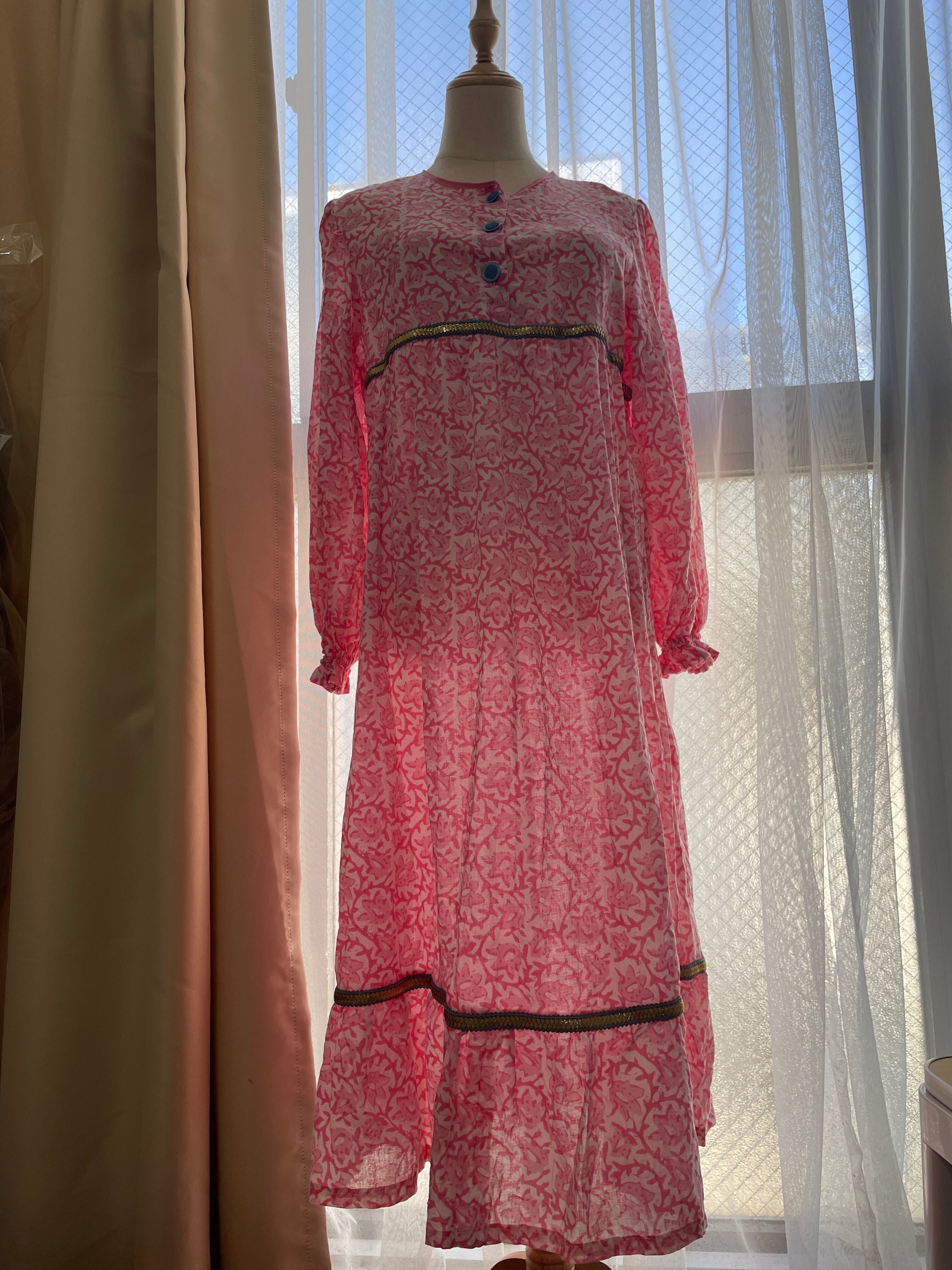 お部屋時間やおやすみの時間に、お部屋で着ていただけるルームドレスです。写真のサンプルはインドの生地、リボンで作っておりますが、お好きな色やテイスト、サイズでオーダーいただくことができます。袖はゴムで絞ってあるので、水仕事などもしていただきやすいと思います。